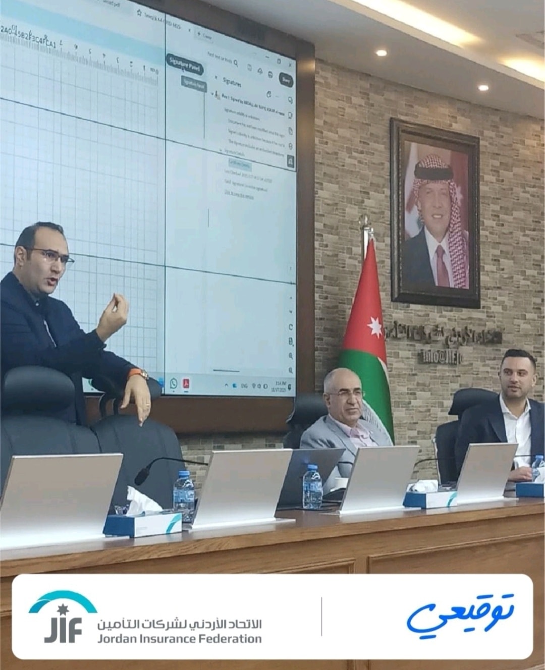 انسجاما مع توجهات الاتحاد لدعم وتعزيز عملية التحول الرقمي في قطاع التأمين ورشة عمل تعريفية بالتعاون ما بين الاتحاد الأردني لشركات التأمين وشركة توقيعي"حول التوقيع الالكتروني ومزايا استخدامه من شركات التأمين 1/12/2025